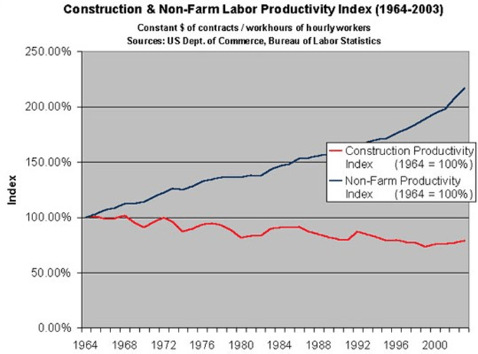 Since the construction industry has struggled to create an increasingly productive labor force, this means that onsite manhours continue to increase at a higher rate than contract value. The National Institute of Building Science produced a report (2007) noting that from 1964 to 2003, construction was the only non-farm industry to have a decline in labor productivity during that timeframe. Meanwhile, all other non-farm industries increased by over 100%! Figure 1 illustrates this divide.
